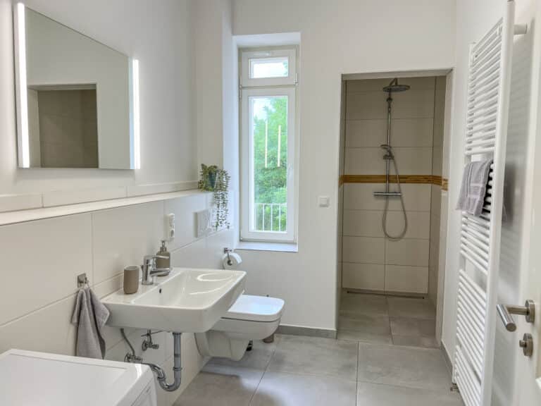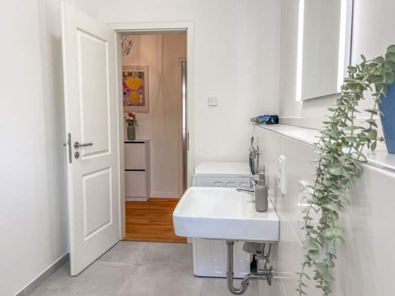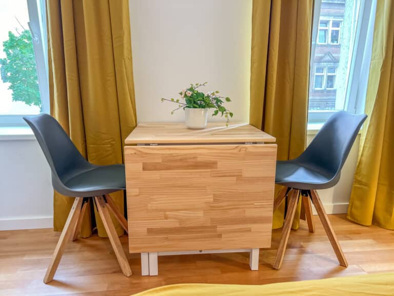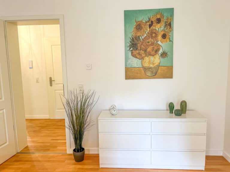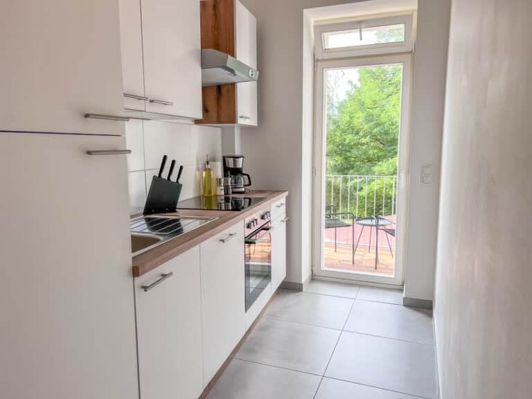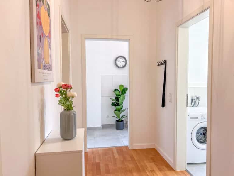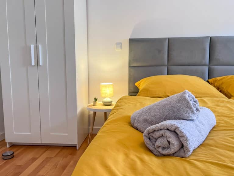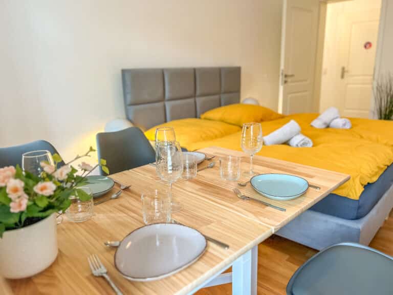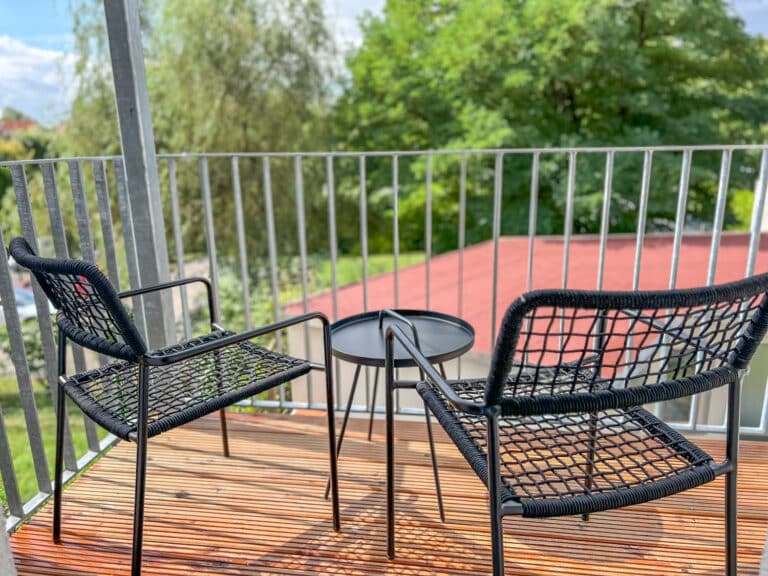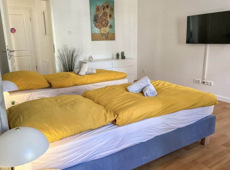 Eine umfangreiche Ausstattung und ein stilvoller und gemütlicher Flair laden zum Wohlfühlen ein. Die beiden Schlafzimmer verfügen jeweils über zwei sehr bequeme 1,80m breite Doppelbetten. Jedes Zimmer verfügt über einen Esstisch, einen TV, ein Spiegel, Kleiderbügel und eine Kommode/einen Kleiderschrank um die Kleidung zu lagern. Für den gemeinsamen Abend kann bei Bedarf an einem ausklappbaren Tisch in einem der Schlafzimmer zu viert Platz gefunden werden. Außerdem bietet die Unterkunft eine Dusche und eine Waschmaschine. Der gemütliche Balkon bietet eine perfekte Möglichkeit um den Abend entspannt ausklingen zu lassen.