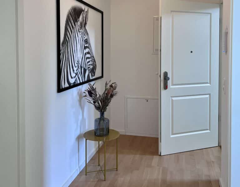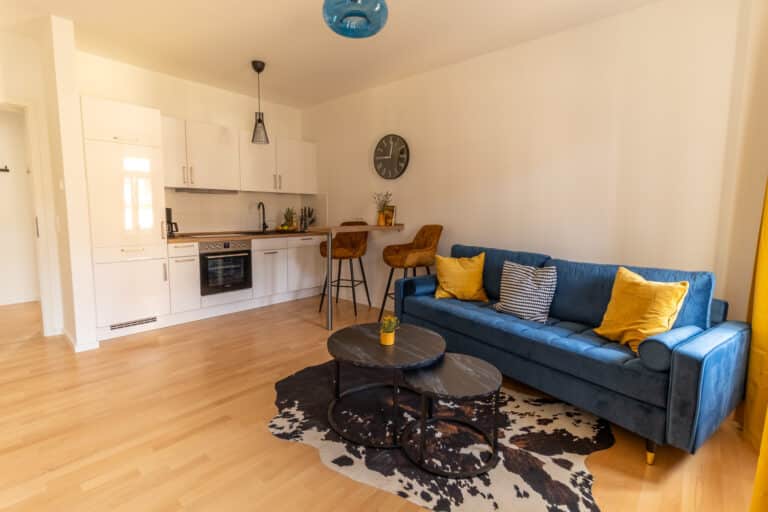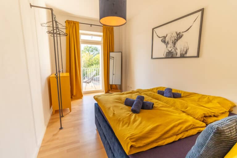 Eine umfangreiche Ausstattung und ein stilvoller und gemütlicher Flair laden Sie zum Wohlfühlen ein. Das Schlafzimmer verfügt über ein gemütliches 160cm Boxspringbett. Außerdem bietet die Unterkunft eine Dusche und eine Waschmaschine. Der Balkon geschmückt mit einer gemütlichen Lichterkette ist ein besonders schöner Ort, um den Abend ausklingen zu lassen.