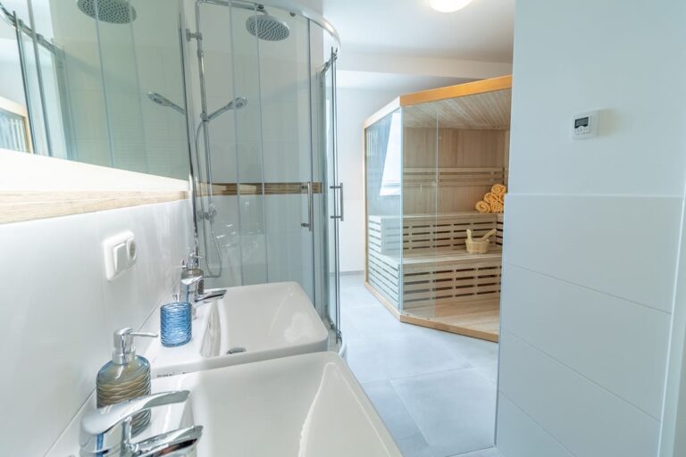 Die Unterkunft selbst verfügt über drei Schlafzimmer im unteren Bereich der Wohnung. Ebenso die beiden Bäder sind in diesem Bereich der Wohnung. Das Hauptbad verfügt über zwei Waschbecken, LED Spiegel, Dusche, WC und der geräumigen Sauna für 6 Personen. Das zweite Bad beinhaltet eine Badewanne, ein Waschbecken und ein WC. Ebenso ist die Waschmaschine in diesem Bad enthalten. Die Küche befindet sich auf der selben Etage wie die Schlafzimmer. Hell und offen läuft die Treppe über der Küche entlang direkt in die obere Etage, wo sich ein Loft befindet, welches mit Dachterrasse, Hängesessel, gemütlicher Liegeecke, Essbereich und zwei Designerstühlen und Motorrad-Bar euren Aufenthalt einzigartig machen wird. Die Ausstattung des Penthouses bietet alles was das Herz begehrt.